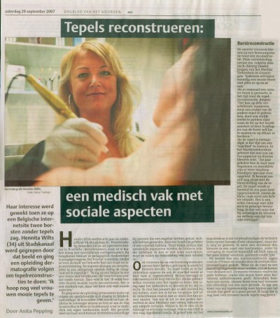 30-09-2007 21:00Zaterdag stond Hennita in de krant met een groot interview over Dermatografie. Het geeft goed aan wat haar specialiteiten zijn. En ook wat ze voor mensen die bosrtkanker hebben gehad of een ander naar litteken hebben, kan betekenen.